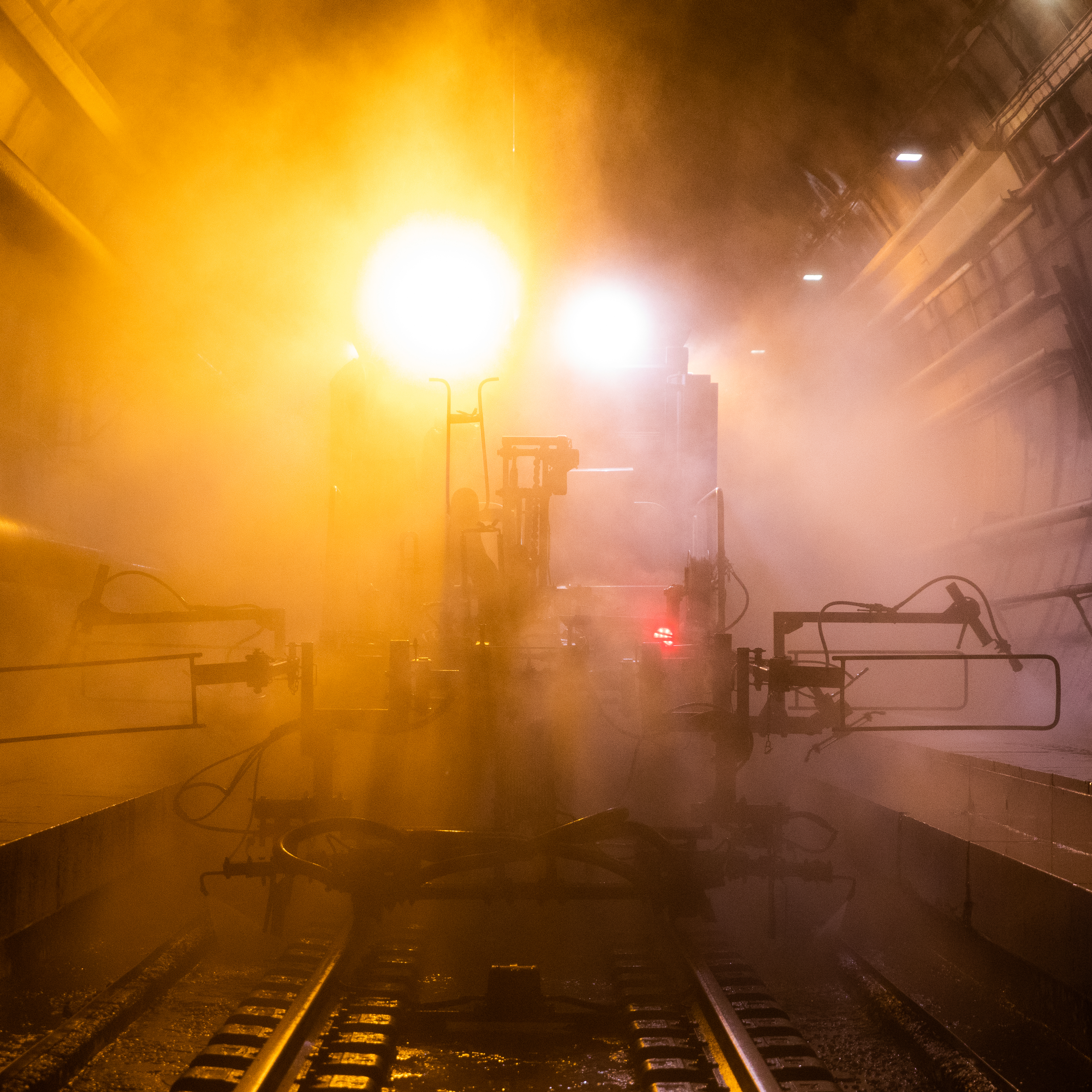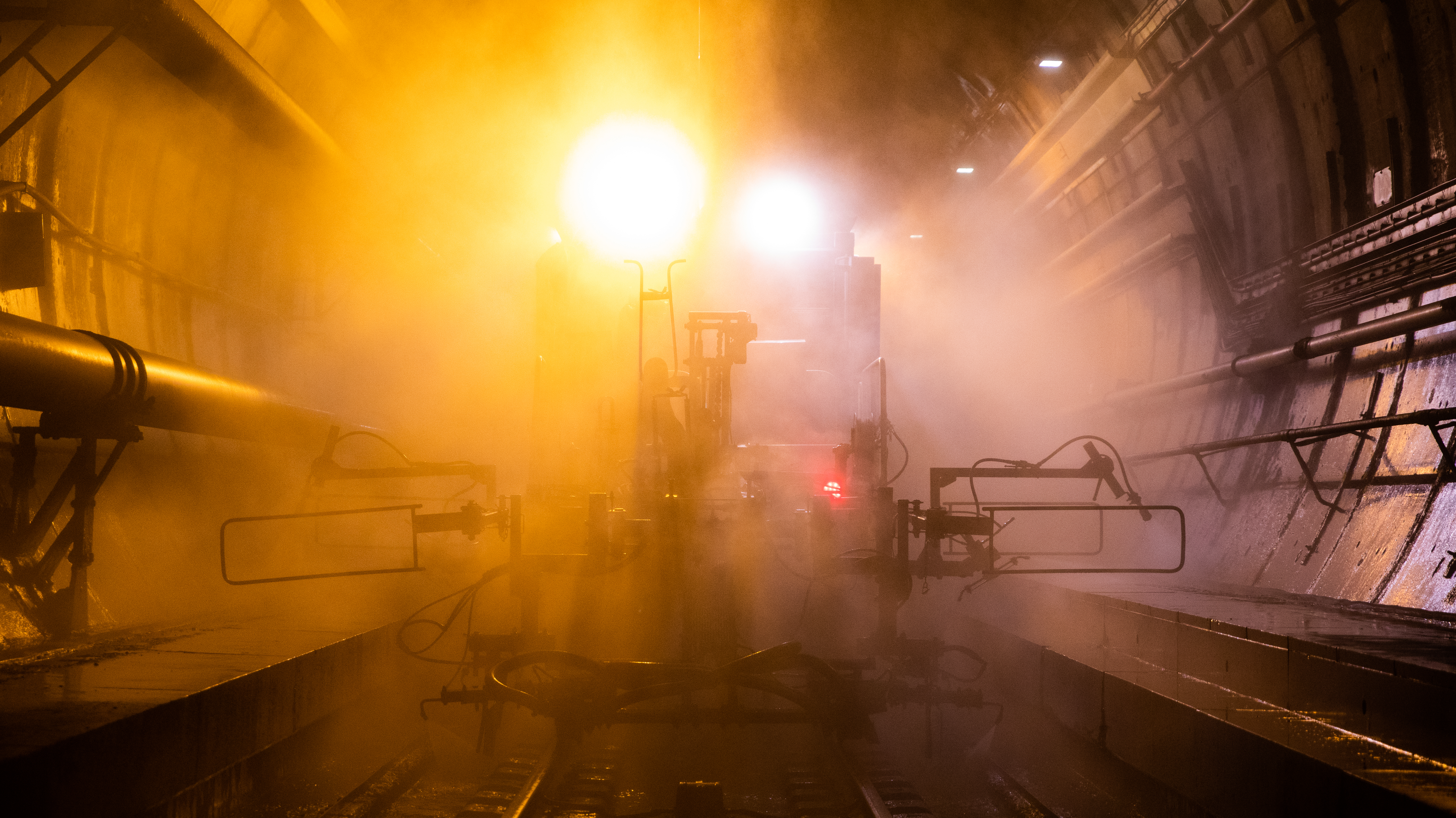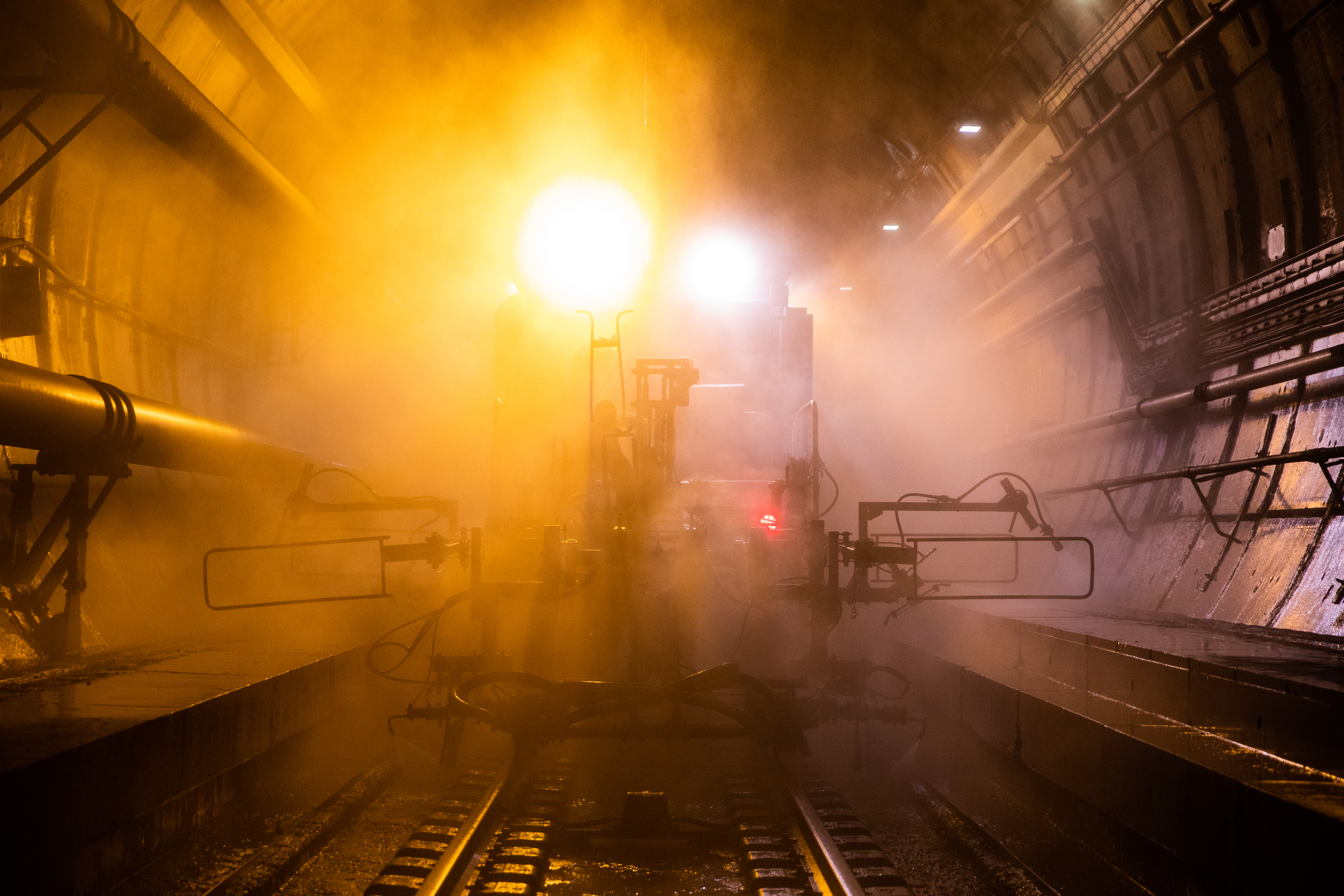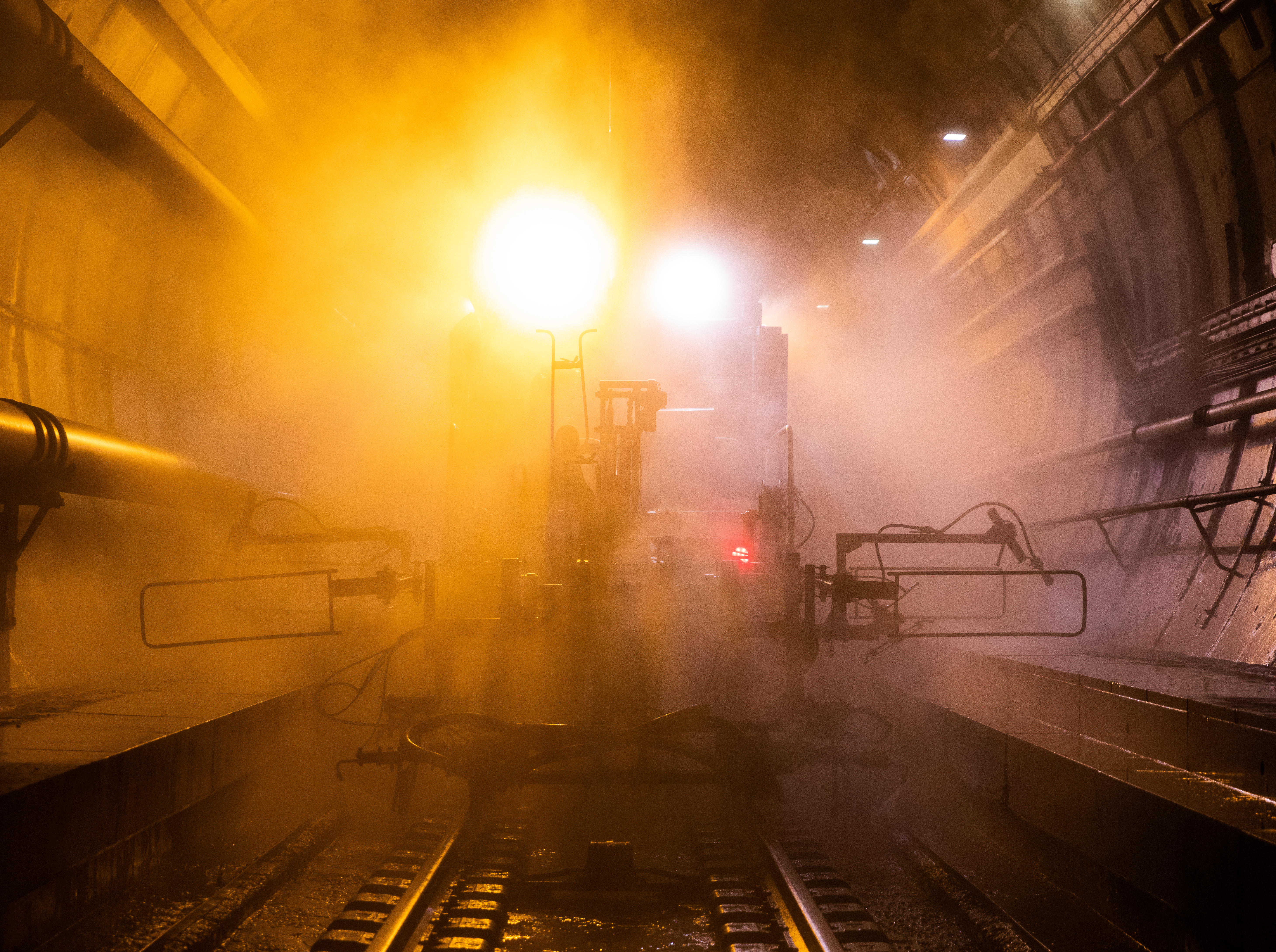Opérations de nettoyage d’un des tunnels ferroviaires au moyen d’un train de travaux durant une nuit de maintenance.